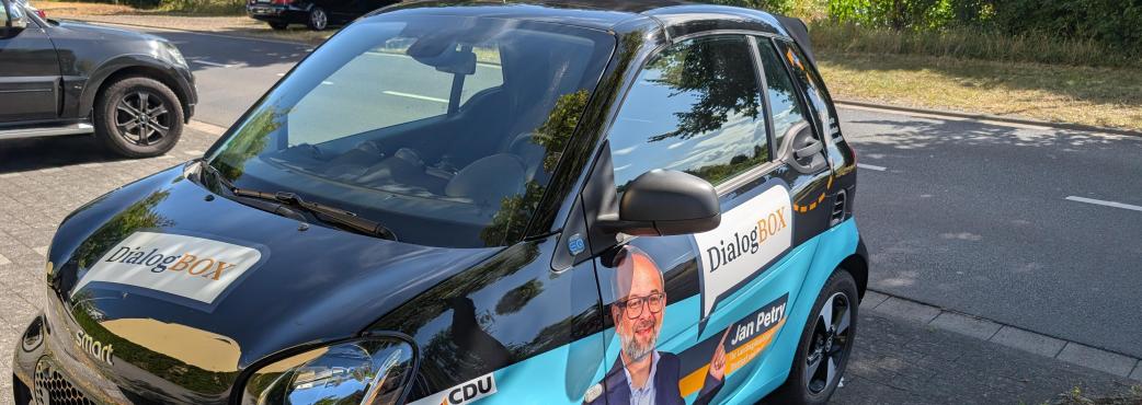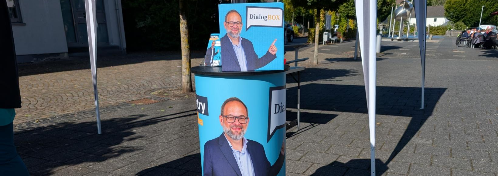 Im Wahlkampf kann ich nicht überall sein. Deshalb biete ich Ihnen an, über die Dialogbox mit mir in Kontakt zu treten. Unter “Termine” können Sie sehen, wann die Box wo steht. Darüber hinaus veröffentliche ich in den sozialen Medien, in welchen Geschäftslokalen meine kleinen Dialogboxen aufgestellt sind. Dort könnt Ihr eine Postkarte ausfüllen, in die Box einwerfen und so Kontakt mit mir aufnehmen!